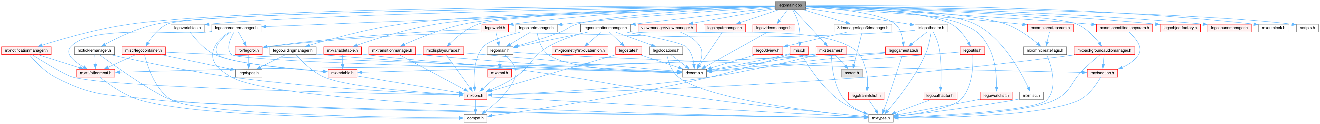 #include "legomain.h"#include "3dmanager/lego3dmanager.h"#include "islepathactor.h"#include "legoanimationmanager.h"#include "legobuildingmanager.h"#include "legocharactermanager.h"#include "legogamestate.h"#include "legoinputmanager.h"#include "legoobjectfactory.h"#include "legoplantmanager.h"#include "legosoundmanager.h"#include "legoutils.h"#include "legovariables.h"#include "legovideomanager.h"#include "legoworld.h"#include "legoworldlist.h"#include "misc.h"#include "misc/legocontainer.h"#include "mxactionnotificationparam.h"#include "mxautolock.h"#include "mxbackgroundaudiomanager.h"#include "mxdisplaysurface.h"#include "mxmisc.h"#include "mxnotificationmanager.h"#include "mxomnicreateflags.h"#include "mxomnicreateparam.h"#include "mxstreamer.h"#include "mxticklemanager.h"#include "mxtransitionmanager.h"#include "mxvariabletable.h"#include "scripts.h"#include "viewmanager/viewmanager.h"